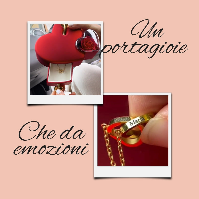 si tira delicatamente la freccia, il cassetto si apre e svela la collana con i due cuori intrecciati, incisi con un ricordo che parla solo a voi.