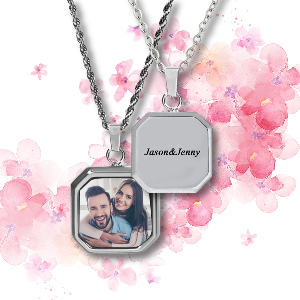 Il ciondolo cambia aspetto con il calore del corpo, rivelando una foto speciale. Il retro, personalizzabile, aggiunge un tocco unico e intimo.